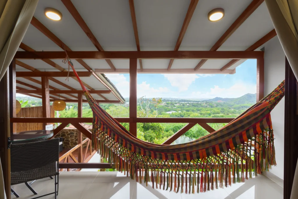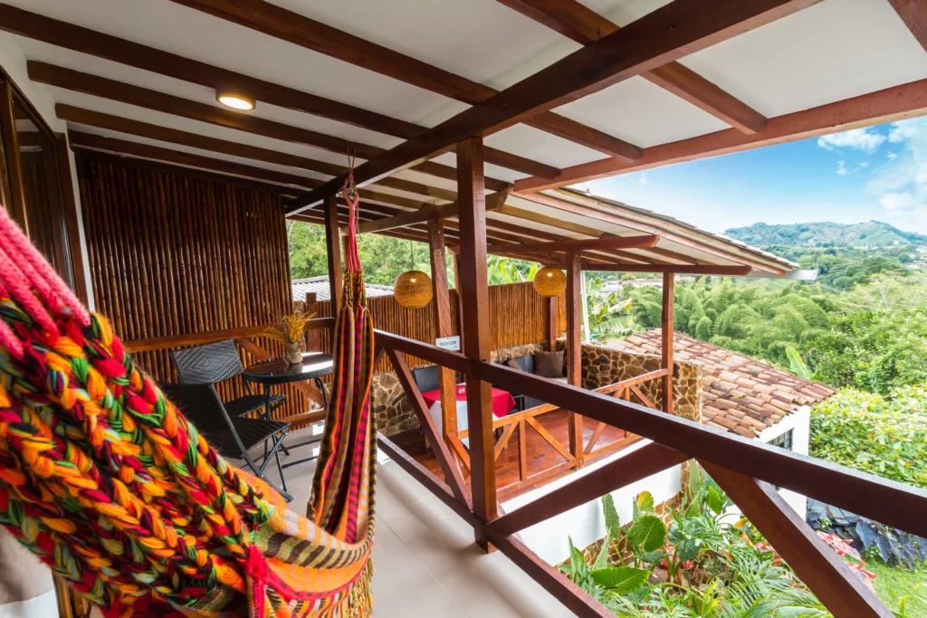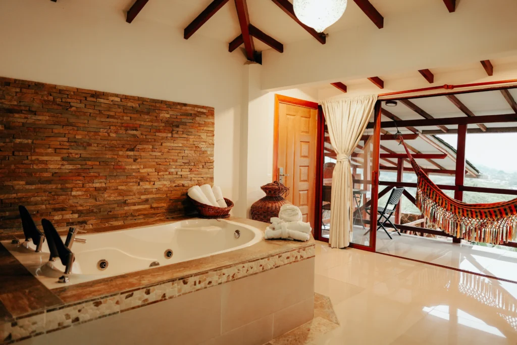 Suite cómoda y privada, con balcón, chimenea y una vista privilegiada al paisaje cafetero. Ideal para disfrutar de una estadía tranquila en pareja, relajarse en el jacuzzi, leer un libro en la hamaca o simplemente contemplar las montañas desde la comodidad del espacio.