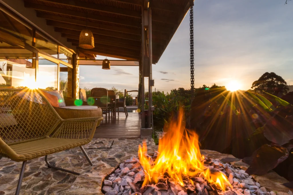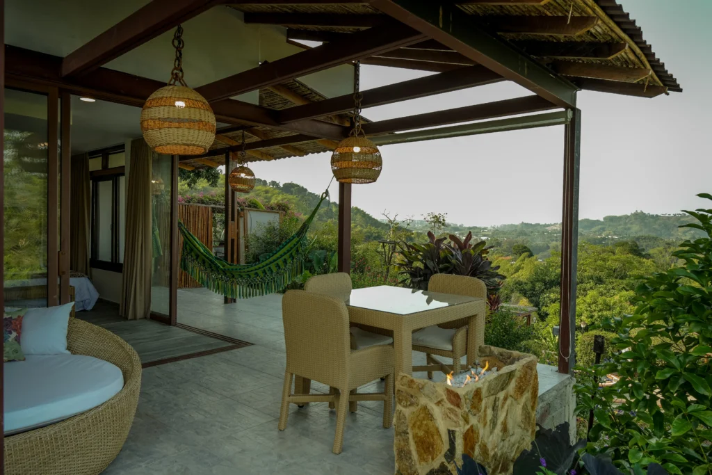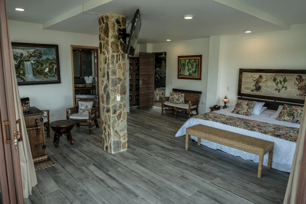 Suite cómoda y privada, con balcón, chimenea y una vista privilegiada al paisaje cafetero. Ideal para disfrutar de una estadía tranquila en pareja, relajarse en el jacuzzi, leer un libro en la hamaca o simplemente contemplar las montañas desde la comodidad del espacio.